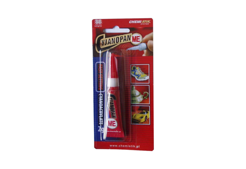 Cyjanopan ME это однокомпонентный, не содержащий растворителей цианакриловый клей моментального действия. Отвердевание шва происходит в результате внезапной полимеризации под воздействием влажности находящейся на соединяемых элементах. Клеями серии Cyjanopan МE можно склеивать: металл, резину, стекло, керамику, древесину (породы со щелочной поверхностью) а также пластмассы (за исключением ПЭ, ПП, ПТФЭ и силикона). Клей Cyjanopan MЕ красный спользуется для склеивания твердых соединений, Cyjanopan Е синий рекомендуется для склеивания эластичных соединений